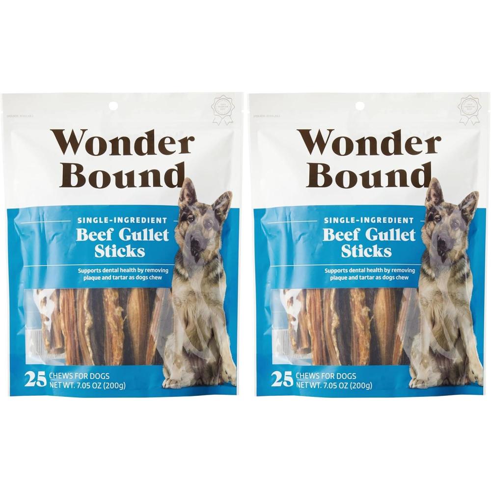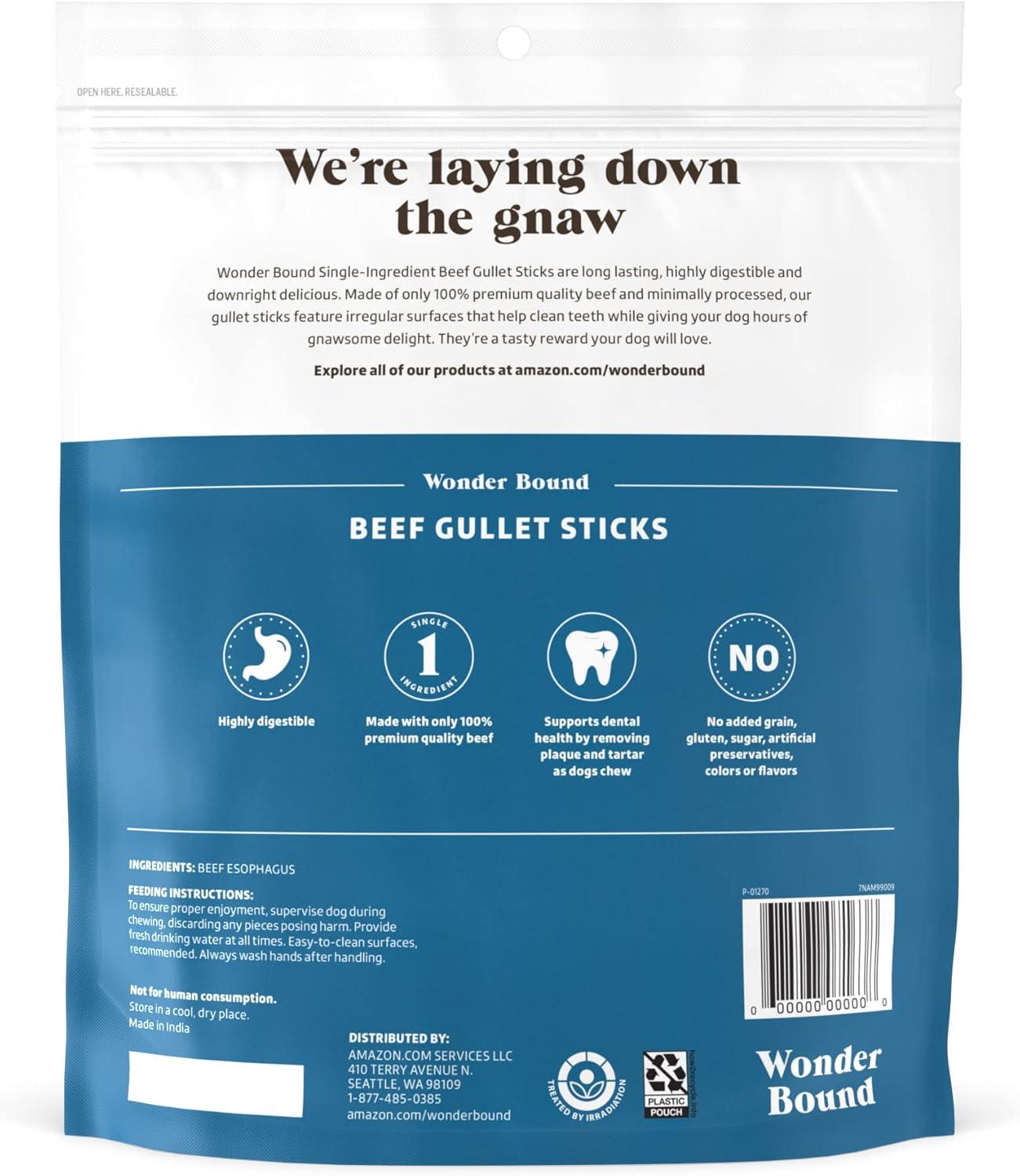 Wonder Bound Single-Ingredient Beef Gullet Sticks are long lasting, highly digestible and downright delicious. Made of only 100% premium quality beef and minimally processed, our gullet sticks feature irregular surfaces that help clean teeth while giving your dog hours of gnawsome delight. They're a tasty reward your dog will love.