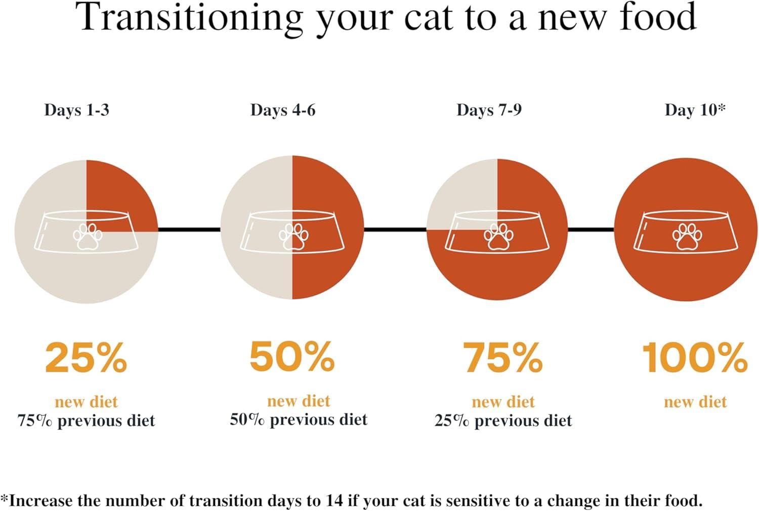 TRANSITION GUIDANCE: For the best transition to Wonder Bound, mix a small amount of our food with your cat’s previous food over a period of 7-10 days, increasing the ratio of Wonder Bound to previous food each day