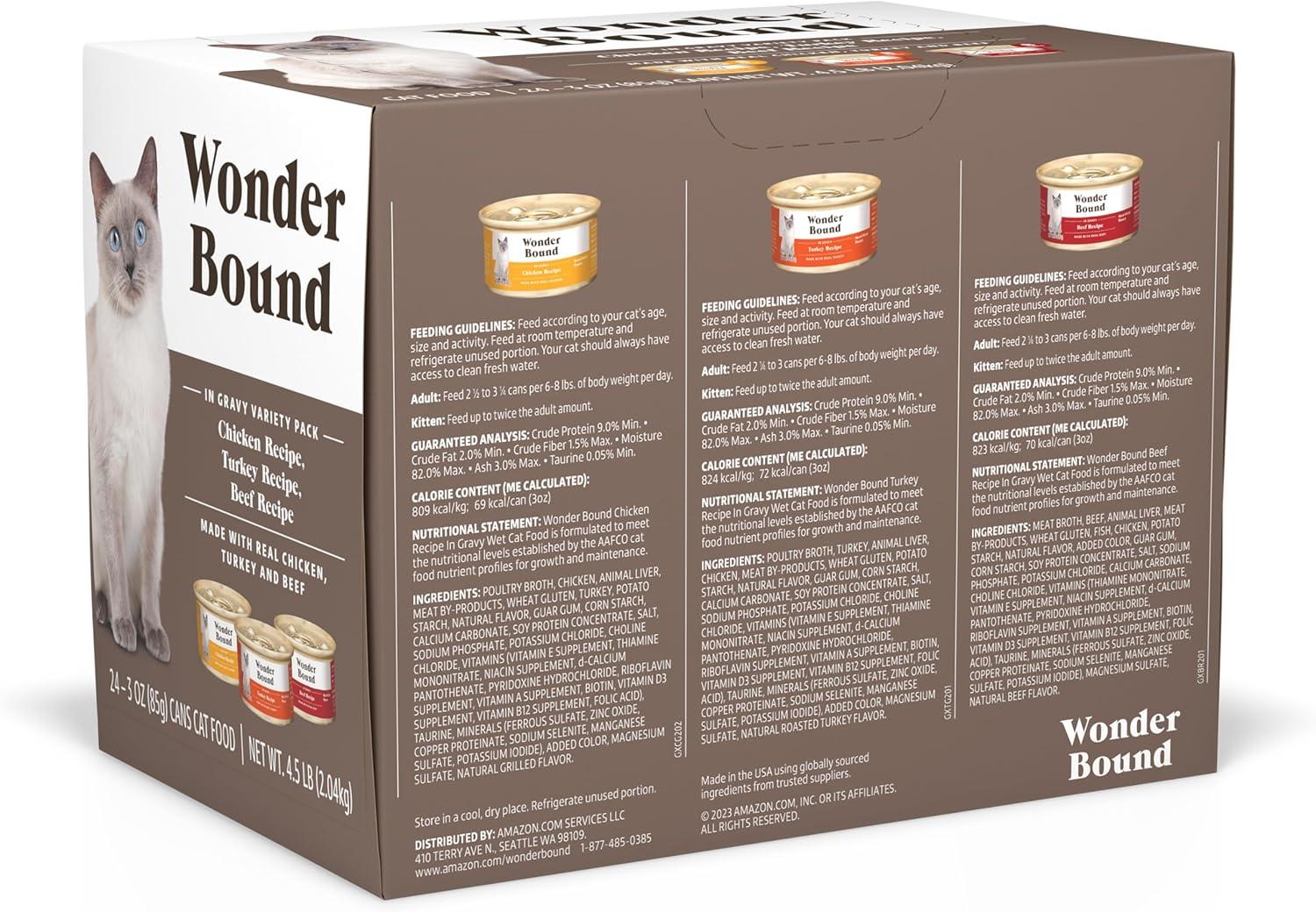 Amazon Brand - Wonder Bound Canned Wet Cat Food (Salmon Recipe in Gravy), No Artificial Flavors, Adult Recipe, 3 Ounce (Pack of 24)(Variety Pack (Turkey Chicken Beef))
