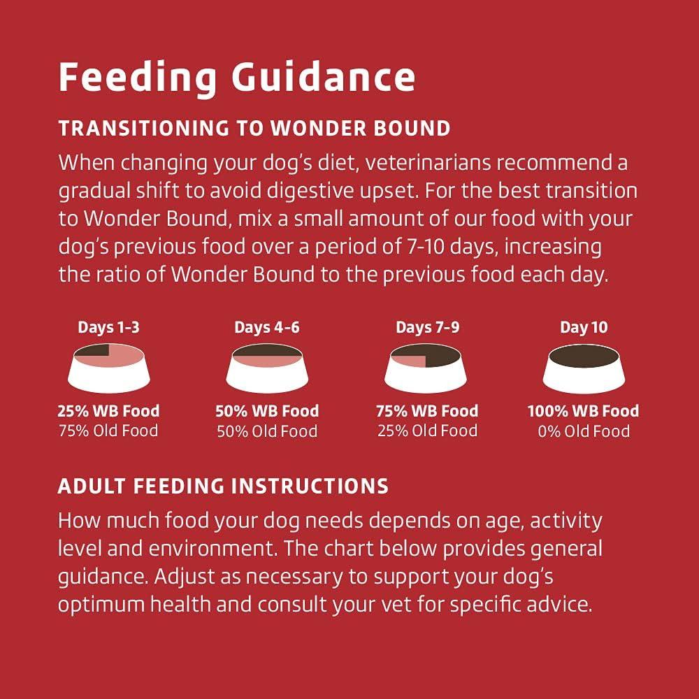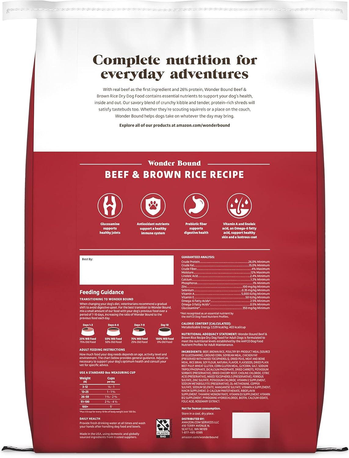 Complete nutrition for everyday adventures. With real meat as the first ingredient and 26% protein, Wonder Bound Dry Dog Food contains essential nutrients to support your dog's health, inside and out. Our savory blend of crunchy kibble and tender, protein-rich shreds will satisfy tastebuds too. Whether they're scouting squirrels or a place on the couch, Wonder Bound helps dogs take on whatever the day may bring.